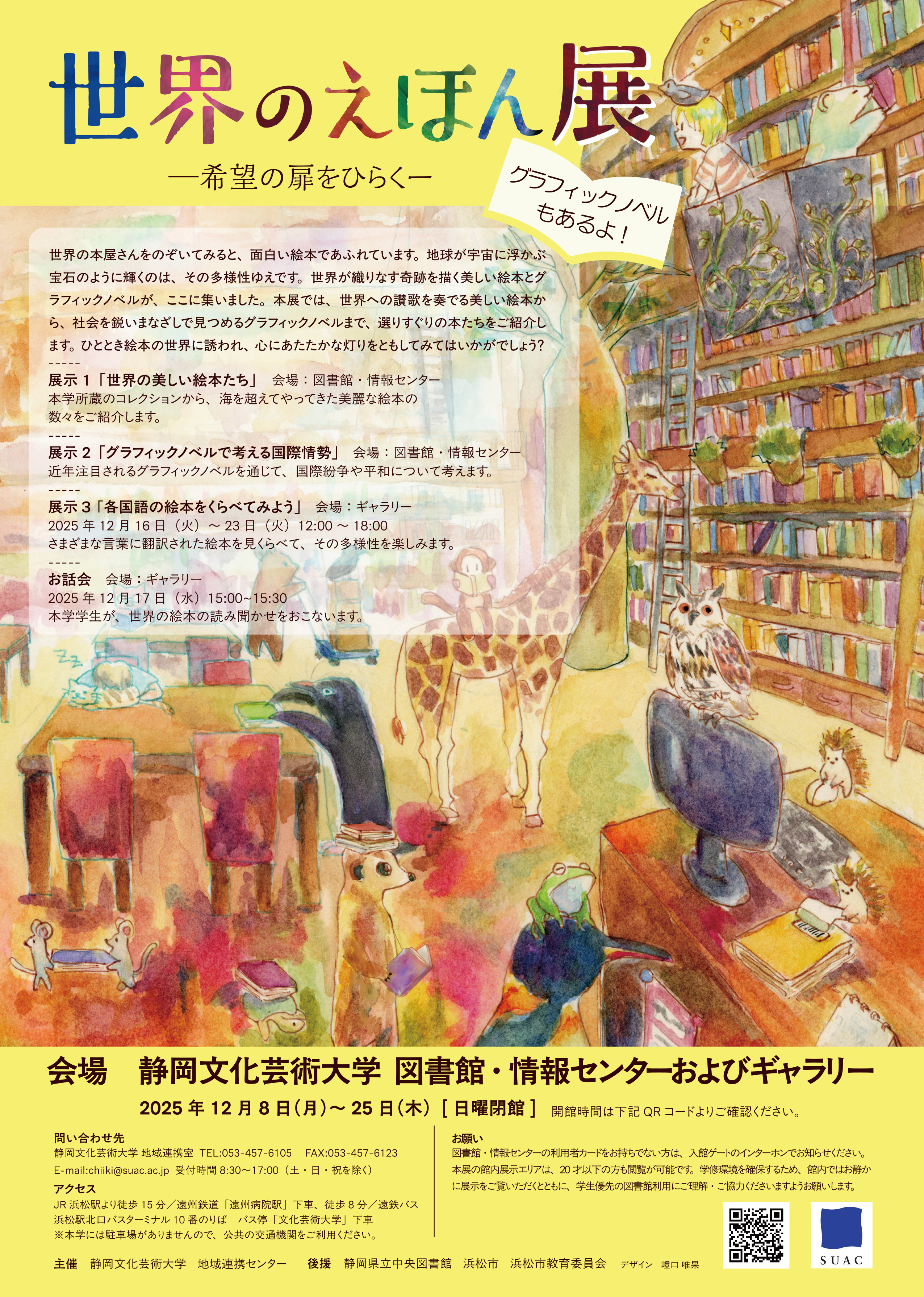 静岡文化芸術大学 図書館・情報センターにて、「世界のえほん展ー希望の扉をひらくー」を開催いたします。ポスターは、かわゼミの嶝口唯果さんがデザインしてくださいました。展示の世界観に寄り添ったやわらかい雰囲気の素敵なビジュアルです。